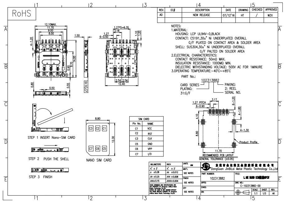 • 102313882-NANO SIM 掀盖6PIN卡座 小卡通讯手机读卡器 H1.5卡座连接器